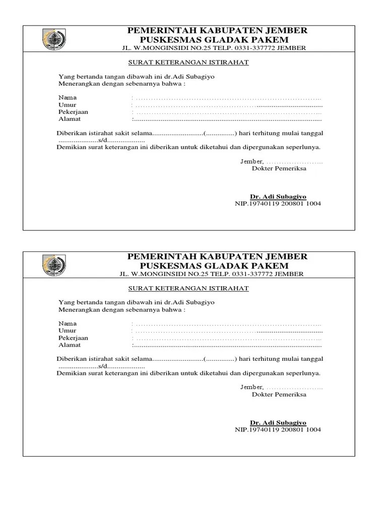 Find out the newest pictures of contoh surat dokter jember here, and also you can have the picture here simply. Tidak hanya untuk meminta izin tidak mengikuti kegiatan tertentu saja, surat dokter juga biasanya digunakan untuk menunjukkan kondisi pasien, melamar pekerjaan dan masih banyak lagi. Demikian surat izin tidak … contoh surat izin tidak masuk kerja tanpa surat dokter. Contoh surat dokter jember picture submitted ang published by … Surat keterangan sakit docx pemerintah kabupaten jember puskesmas gladak pakem jl w monginsidi no 25 telp 0331 337772 jember surat keterangan course hero.